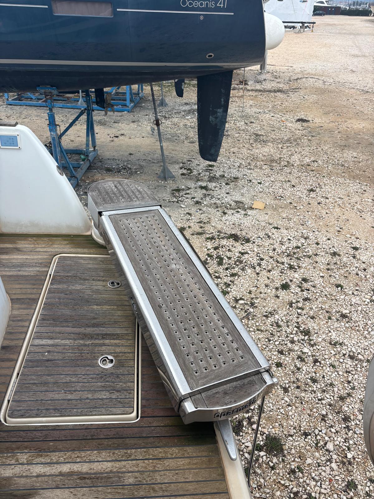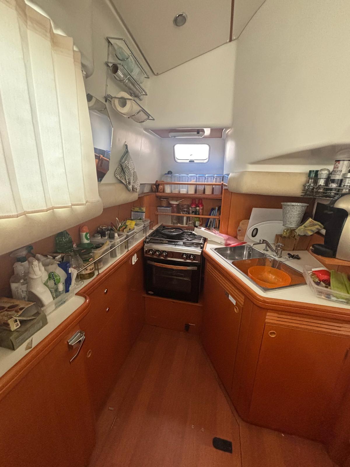 After the success of the Lagoon Power 43, launched in 2000, Lagoon presents the Lagoon Power 44, a new model for the 2005-2006 season. This well-equipped and luxurious motorized catamaran provides maximum comfort for the owner and guests. – A particularly convivial new Fly bridge: Three people can sit at the steering station in individual chairs; up to six people can sit comfortably around the table; people can relax on 2 sundecks, one of them in the shape of a lounge chair to the left of the helm station and the other to the rear of the table seating area; For safety at sea, the Fly bridge access can be closed. – The helm station can include: an instrument console capable of displaying two 12″ screens, an autopilot remote, a compass, a VHF radio, two engine panels (tachometer, fuel gauge, alarms), engine throttle controls, horn button, windlass remote control, a plexiglass covered recess for charts, cup holders, glove box… – The comfortable seating includes numerous storage compartments. Next to the flying bridge table,a bar cabinet can house an (optional) fridge or storage. – Among the three pilot area seats, the new captain’s seat is adjustable fore and aft and features a large storage drawer beneath it. – A windshield handrail will be installed…and not forgetting the new mast carrying the antenna the radar and the horn. – The cockpit can be totally enclosed (optional).